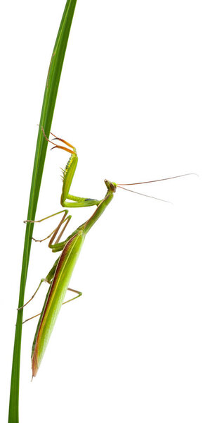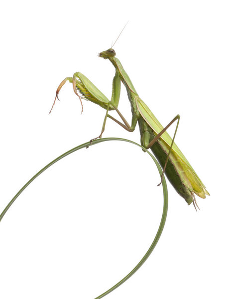 10905529 Female European Mantis or Praying Mantis, Mantis religiosa, on blade of grass in front of white background