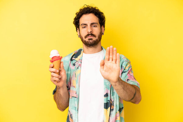 598268496 Crazy bearded man looking serious showing open palm making stop gesture. ice cream and summer concept
