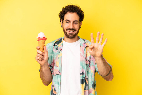 598268606 Crazy bearded man smiling and looking friendly, showing number four. ice cream and summer concept