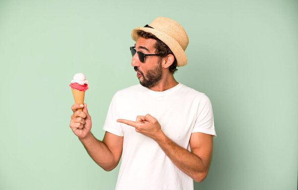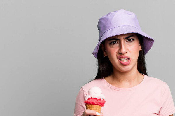 649942656 Hispanic pretty woman looking very shocked or surprised. ice cream and summer concept