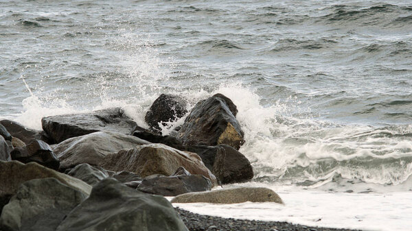 580505604 Waves splashing on the rocks on a cold spring day at the beach.