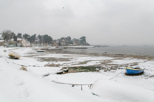 581035644 Brittany, the Ile aux Moines, with a sailing boat in the harbor in winter, under the snow