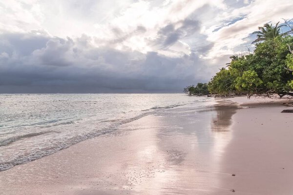 599718888 Pink sand beach, wave, flow and ebb of the sea in Guadeloupe