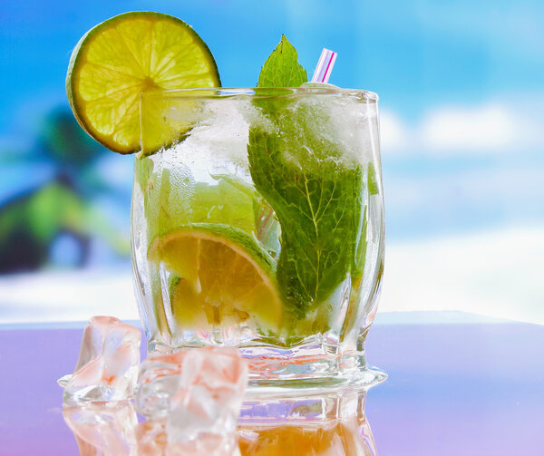 55833303 Mojito cocktail drink. Glasses with lime and ice and leaf of mint.lying on the desk