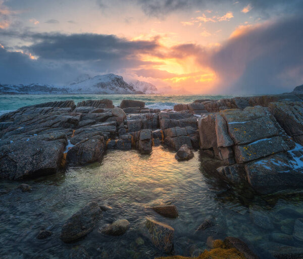 856270546 Rock pools and coastal stones , winter mountains and cold sea water. Arctic landscape with snowy rocks, sea, waves, dramatic cloudy sky at sunset. Travel on Lofoten Islands, Norway. Nature. Seascape