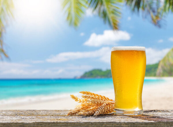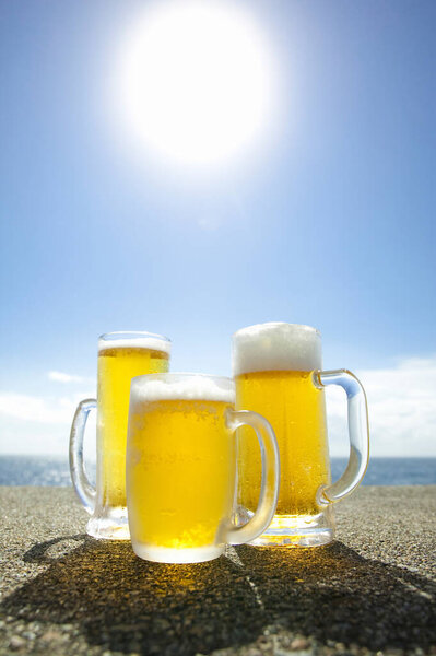 681198742 Close-up view of glasses of beer on the beach at sunny day
