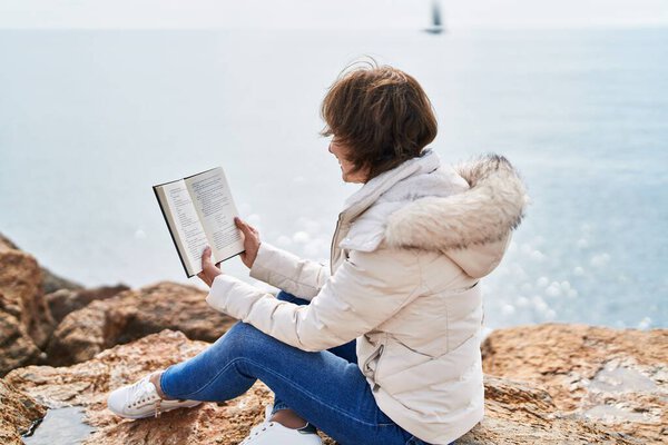 650023972 Middle age woman reading book sitting on the rock at seaside