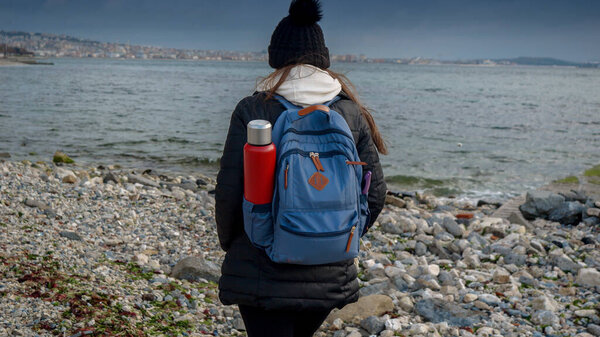 666543518 Young female hiker with backpack and thermos walking on the rocky sea beach at cold cloudy and windy day. Concept of hiking adventure, exploration, tourism and journey