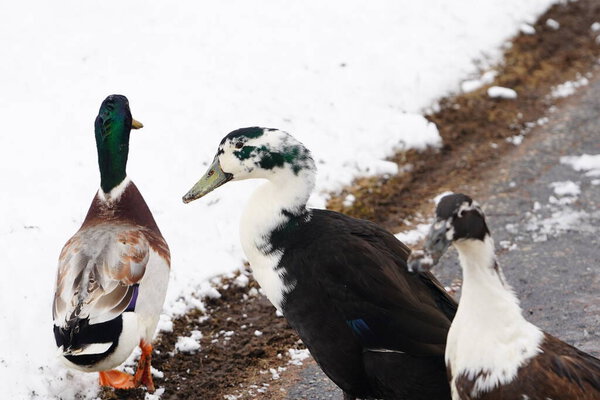 707053856 Black and white Ancona ducks walking out in the cold winter.