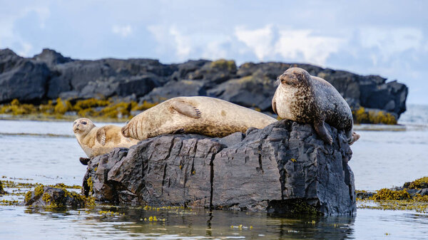 822957942 Three seals lounge on a moss-covered rock in the serene waters of Ytri Tunga, Iceland. The peaceful moment captures the beauty of nature against a backdrop of dramatic cliffs and soft clouds.