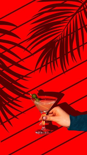 698325356 Contemporary art collage. Neon Martini. Female Hand holds sweet and sour cocktail garnished with green olives against vivid background with plants shadows. Concept of parties and holidays, summertime.