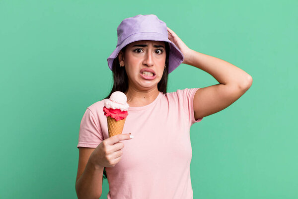 634145722 Feeling stressed, anxious or scared, with hands on head. ice cream and summer concept