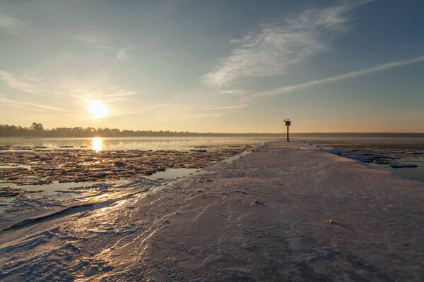 666043710 Frozen cornucopia pier in sunset light