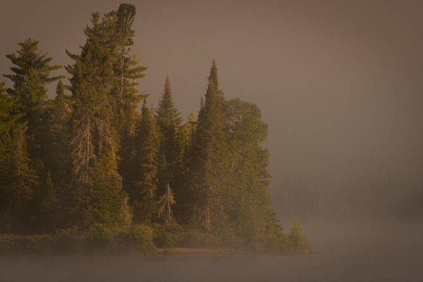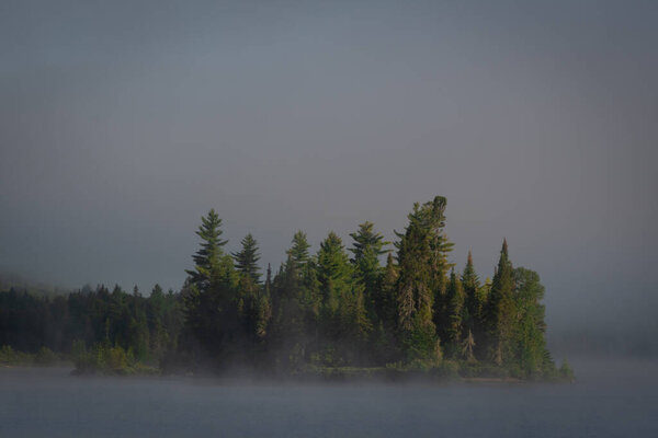 832281742 Dusk sky, foggy river, and tree-covered island