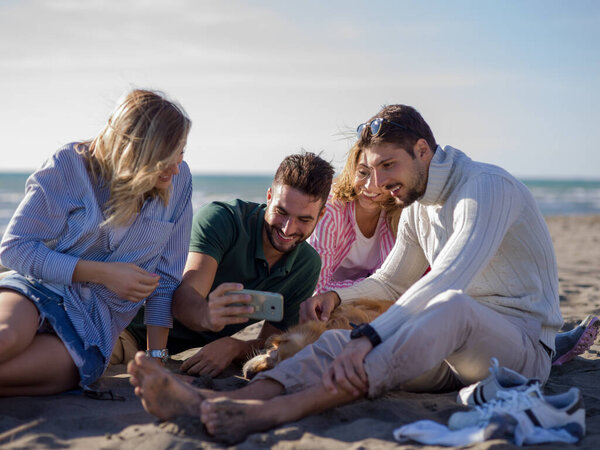 618530558 Group of friends having fun on beach during autumn day