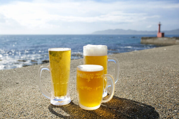 681082790 Close-up view of glasses of beer on the beach at sunny day