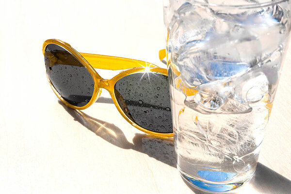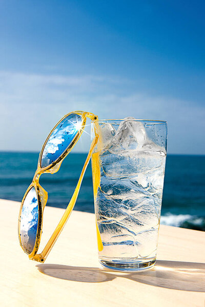 683202050 Glass of water with ice cubes and yellow sunglasses on the background of the sea, concept of summer vacation and relaxation in a sunny day, copy space