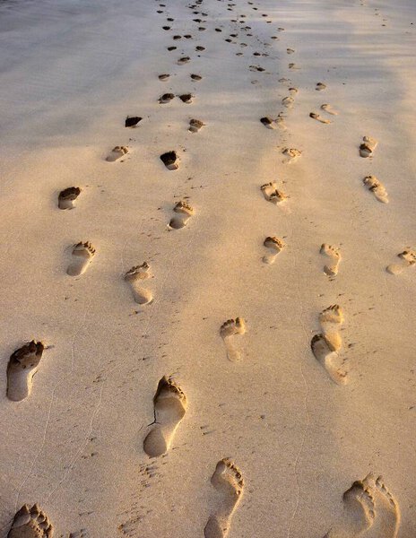 853017256 Close up of footprints in the sand on pristine Galapagos islands beach. High quality photo
