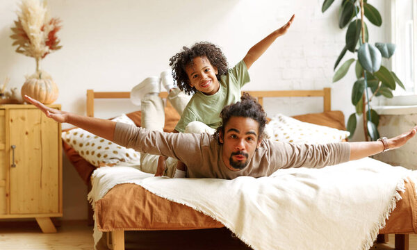 523522166 Happy african american family father and son in flying pose lying on bed while playing and having fun together, cute child little boy spending leisure time with funny dad in bedroom at home