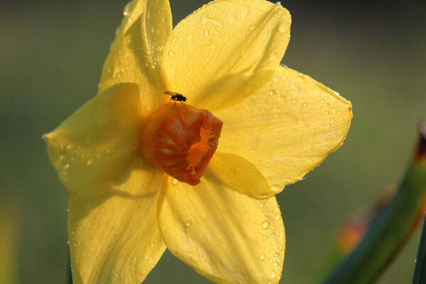 579495766 A closeup shot of a house fly standing on a Jonquil plant sucking the nectar in a garden in daylight