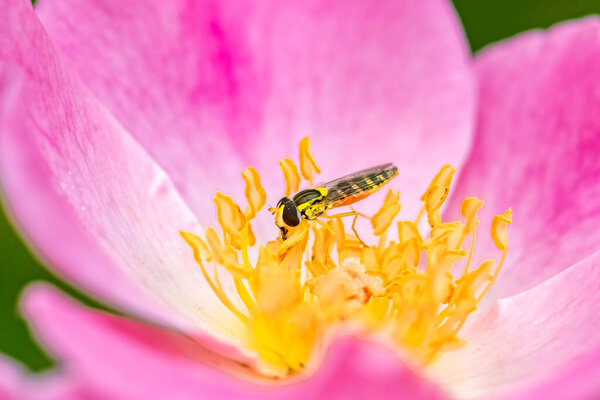 581102562 Hoverfly, Sphaerophoria scripta, insect eating pollen on a rose