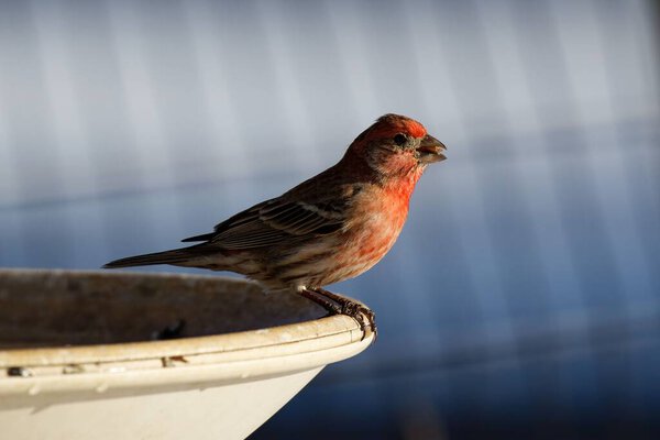 586909806 A scenic view of a red house finch perched on a water fountain in daylight