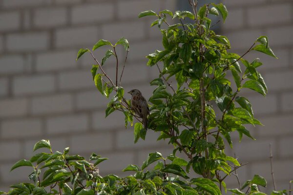 597904778 A scenic view of a small house sparrow perched on a tree branch with green leaves in daylight