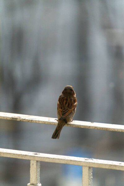 597911184 A small brown house sparrow perched on a metal surface on a sunny day