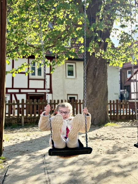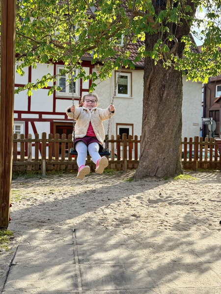 726078710 Adorable little girl having fun on a swing. Happy child on playground on sunny day.