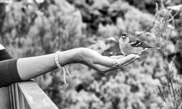 621462726 A woman feeds sparrow from the palm of her hand. A bird sits on a woman's hand and eats seeds. Caring for animals.