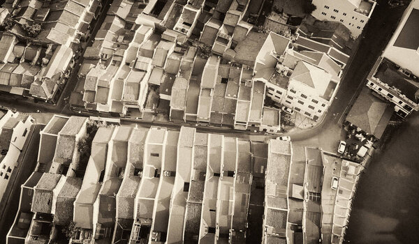 621469352 Malacca, Malaysia. Aerial view of city homes and skyline from drone on a clear sunny day