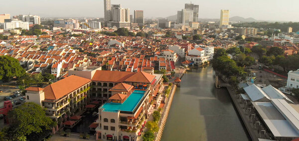 645455648 Malacca, Malaysia. Aerial view of city homes, river and skyline from drone on a clear sunny day