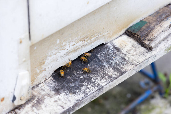 664161614 Honey bees fly next to the bee hive in the apiary to collect honey, close up