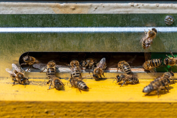 719122418 Swarm of busy honey bees entering beehives in the garden