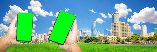 658205396 For creating background banners. beautiful city Bright sky and green screen hand holding copy spaces
