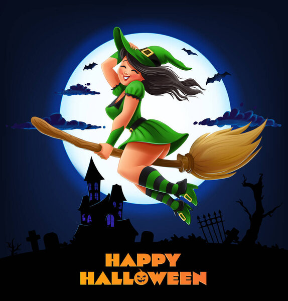 739289640 Witch on broom flies over cemetery on halloween night