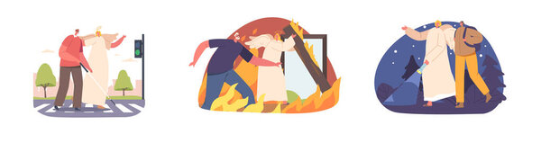 667519432 Isolated Elements with Celestial Being Save People. Angel Keeper Character Help to Blind Man Cross the Road, Tourist Woman in Night Forest and Man Leaving Burning House. Cartoon Vector Illustration