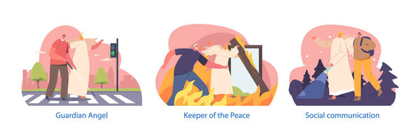 667519884 Isolated Elements with Angel Keeper Character Help to Blind Man Cross the Road, Tourist Woman in Night Forest and Man Leaving Burning House. Celestial Being Save People. Cartoon Vector Illustration