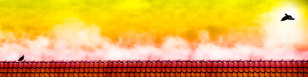 736276798 A white stork couple on old house roof on cloudy sunset sky background