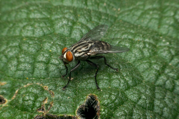 643406444 Large fly on a green leaf