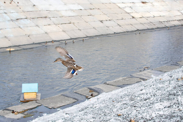 618195442 Mallard, duck in flight on the city river
