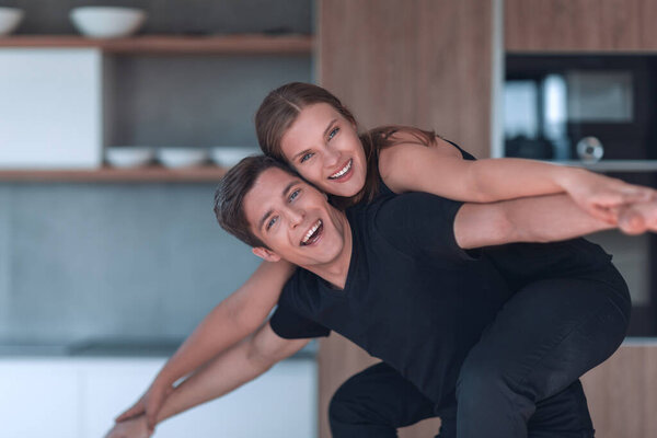618700844 Loving young couple having fun in their kitchen.