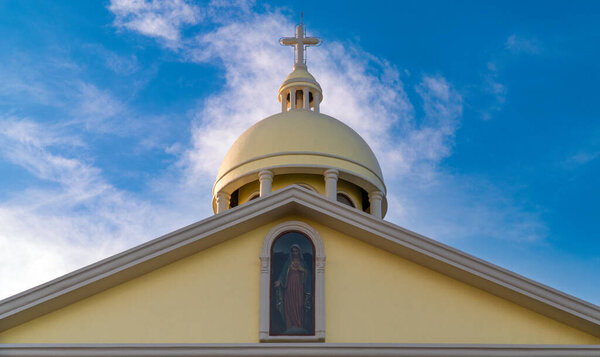 847913620 White and yellow church in Christianity has dome and cross on the top. With a statue of the Lord Mary in front of the gable.