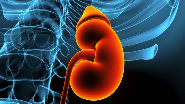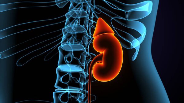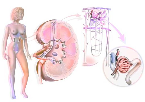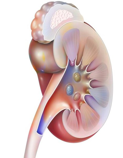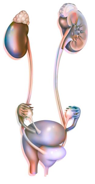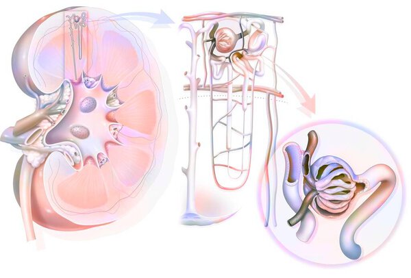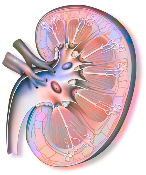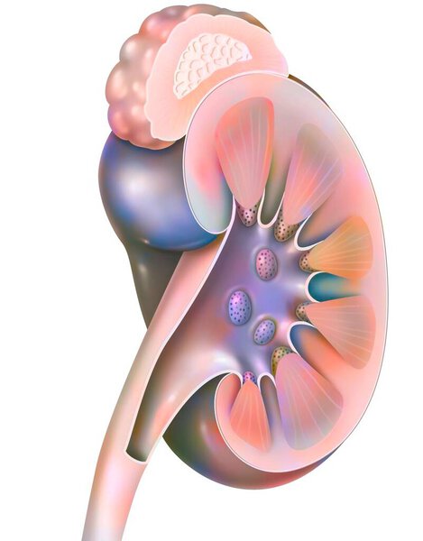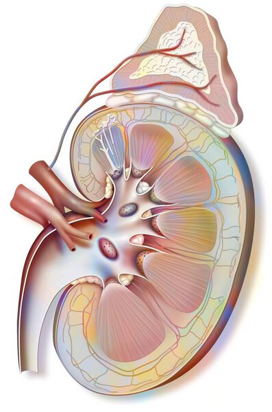 598776400 Kidney and left ureter with a nephron in enlarged size.