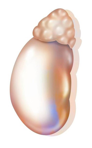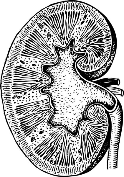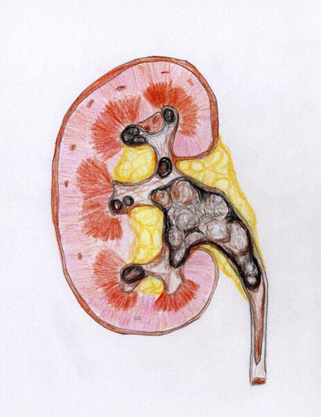 677698418 Kidney stones. Hand drawing illustration depicts a section through a human kidney containing kidney stones (greywish, right).
