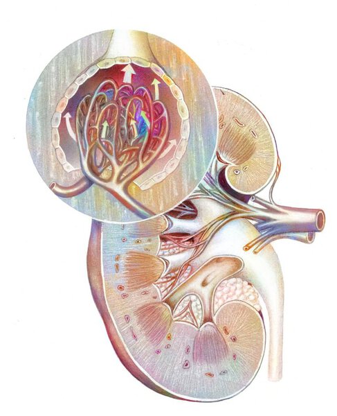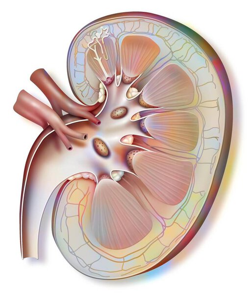 598767526 Urinary system from kidney to glomerulus with structures of kidney and ureter.