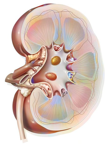 598749896 Urinary system from kidney to glomerulus with structures of kidney and ureter.