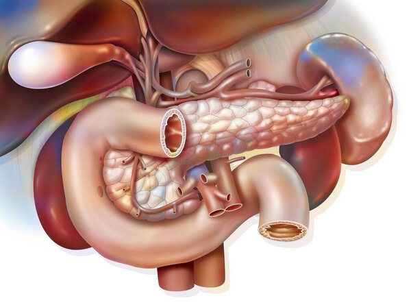 598754248 Human digestive system: Anatomy of duodeno-hepato-pancreatic block.