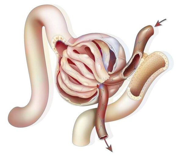 598766886 Anatomy of a renal glomerulus with afferent and efferent glomerular arteriole.