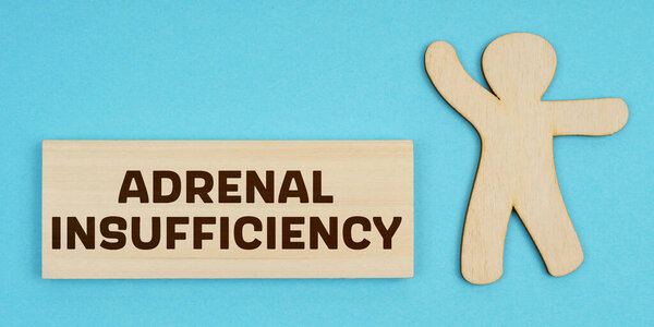 502799508 Medicine concept. On a blue background, a wooden figure of a man and a plate with the inscription - Adrenal Insufficiency